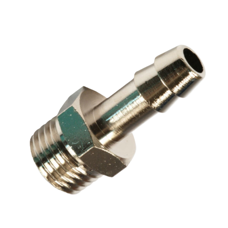 Adaptador de rosca macho a manguera de goma. De aplicación en tomas de aire industrial con salida a manguera (necesita abrazadera de apriete). La rosca es de tipo cilíndrico.