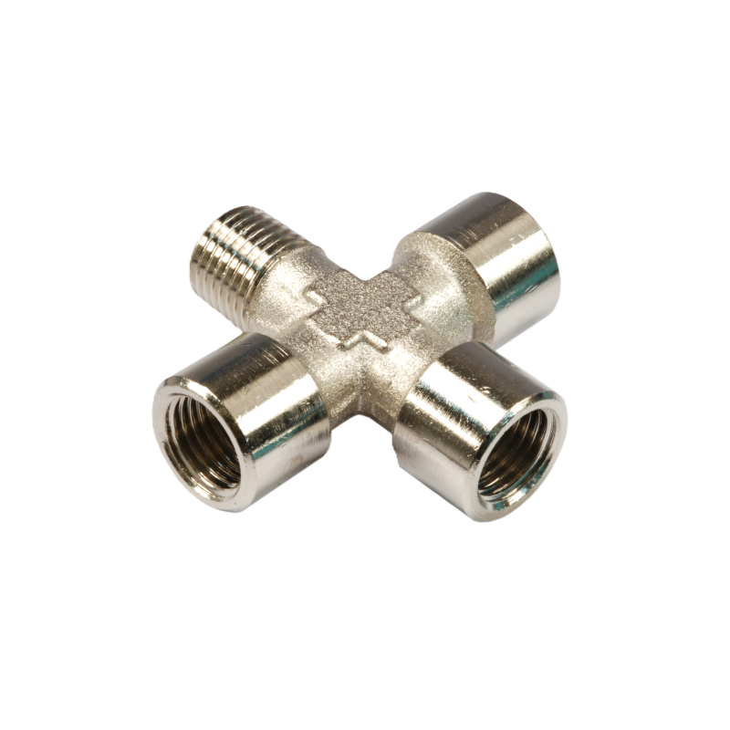 Accesorio roscado en cruz con una salida macho y el resto de salidas roscadas hembras. La rosca macho es de tipo cónico y las roscas hembras son cilíndricas.